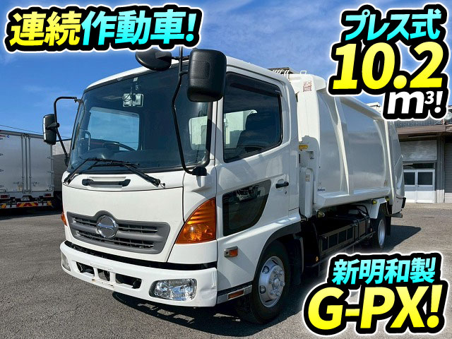 BKG-FC7JGYA H20 日野 レンジャー 圧縮式塵芥車 10.2立米 新明和工業 G-PX プレス式パッカー 押し出し排出 連続作動車 連続スイッチ 6速MT マニュアル 4t 8t 中型 ごみ収集 古紙回収 産業廃棄物運搬